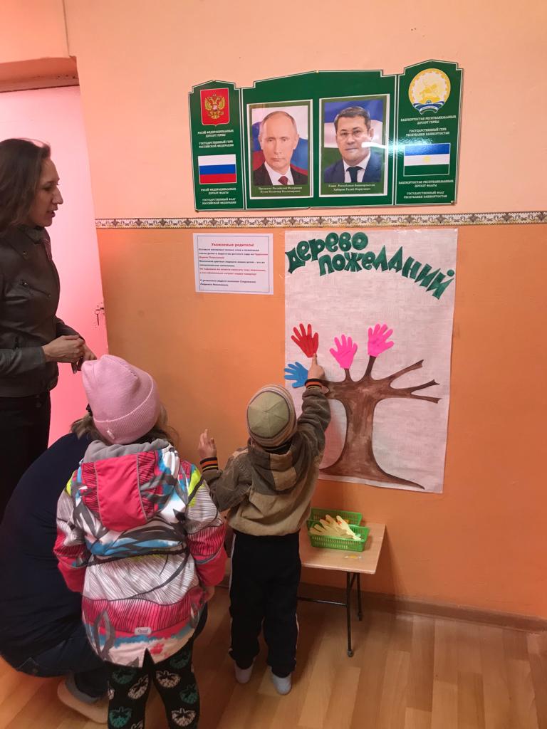 И последний день недели «День мечтаний и пожеланий» начался с акции «Дерево пожеланий», в холле детского сада были нарисованы плакаты, изображающие большое Дерево пожеланий. Утром, при входе в детский сад всем желающим педагогам, детям и родителям (лицам их заменяющих) предлагалось написать какое-нибудь приятное пожелание детям, сотрудникам, педагогам.